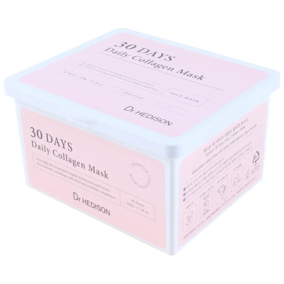 Dr.HEDISON 30 Days Daily Collagen Mask to innowacyjne podejście do codziennej pielęgnacji – jedno opakowanie zawiera aż 30 nasączonych maseczek z kolagenem, które zapewniają intensywne nawilżenie, wygładzenie i poprawę jędrności skóry. Dzięki wygodnej formie i dołączonej pęsecie możesz sięgnąć po świeżą maseczkę każdego dnia, nie tracąc czasu na zbędne kroki pielęgnacyjne. Formuła oparta jest na 7-typowym kompleksie kolagenowym, pantenolu, niacynamidzie oraz kompleksie pięciu kwasów hialuronowych – dla efektu widocznego odmłodzenia, rozświetlenia i dogłębnego nawilżenia. Maseczki wykonano z wegańskiego, biodegradowalnego materiału NudeCell (celuloza roślinna), który idealnie przylega do skóry i pozwala jej „oddychać” nawet przy dłuższym stosowaniu.