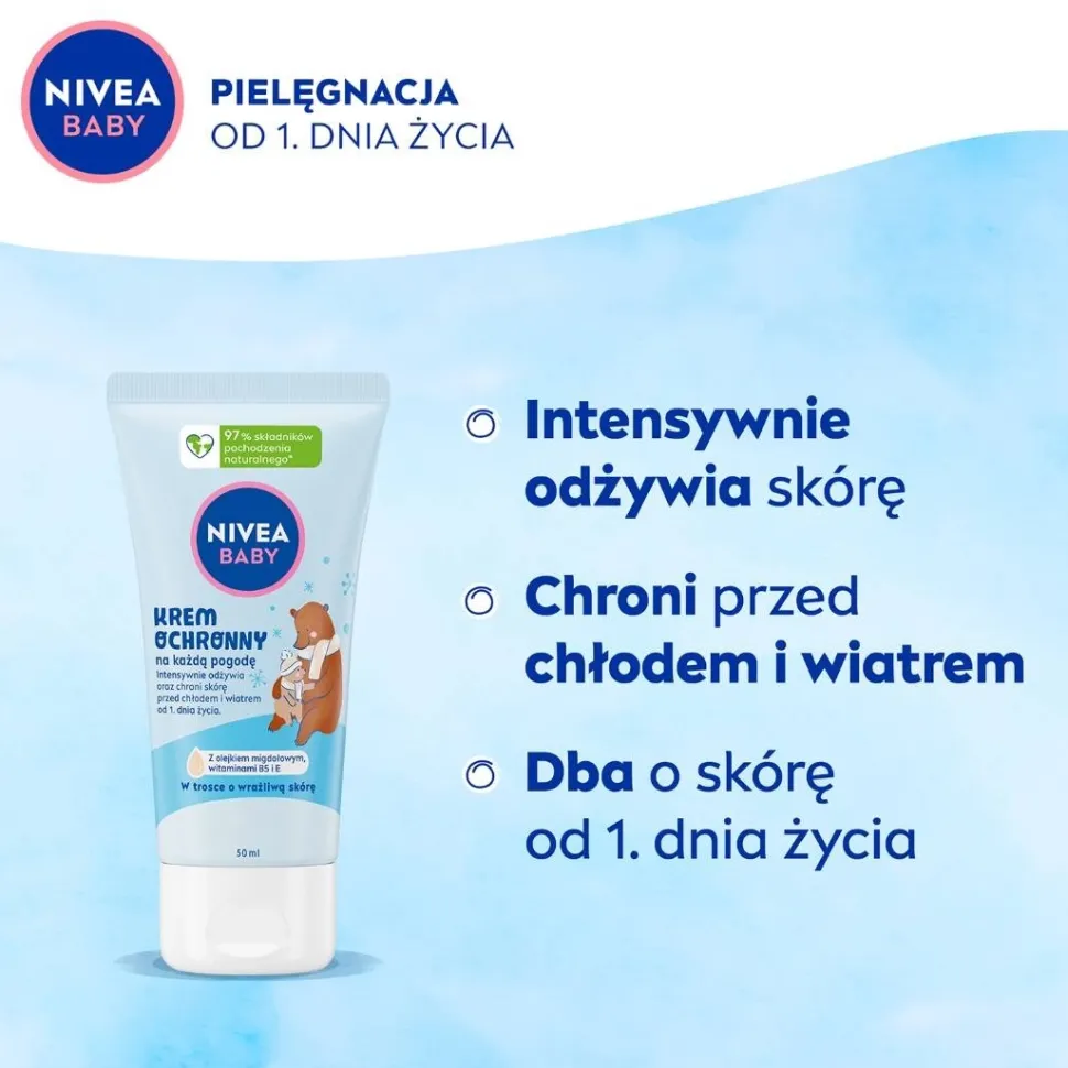 Odkryj NIVEA BABY Krem Ochronny na każdą pogodę, który nie tylko chroni skórę przed chłodem i wiatrem, ale także intensywnie odżywia i wzmacnia skórę dziecka, wspierając jej naturalny proces rozwoju od 1. dnia życia. Zawiera w 100% naturalny olejek migdałowy i witaminy B5 i E. Stworzony tak, aby minimalizować ryzyko alergii**. Produkt rekomendowany przez Instytut Centrum Zdrowia Matki Polki, a jego tolerancja dla delikatnej i wrażliwej skóry niemowląt i dzieci została potwierdzona dermatologicznie. Formuły są łagodne i dbają o delikatną skórę dziecka i naszą planetę. Formuła jest wegańska, biodegradowalna^ i nie zawiera mikroplastiku^^.