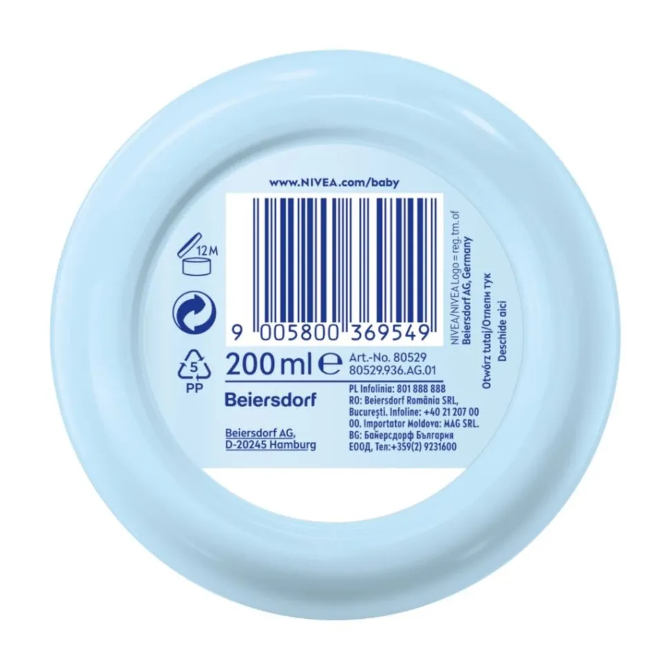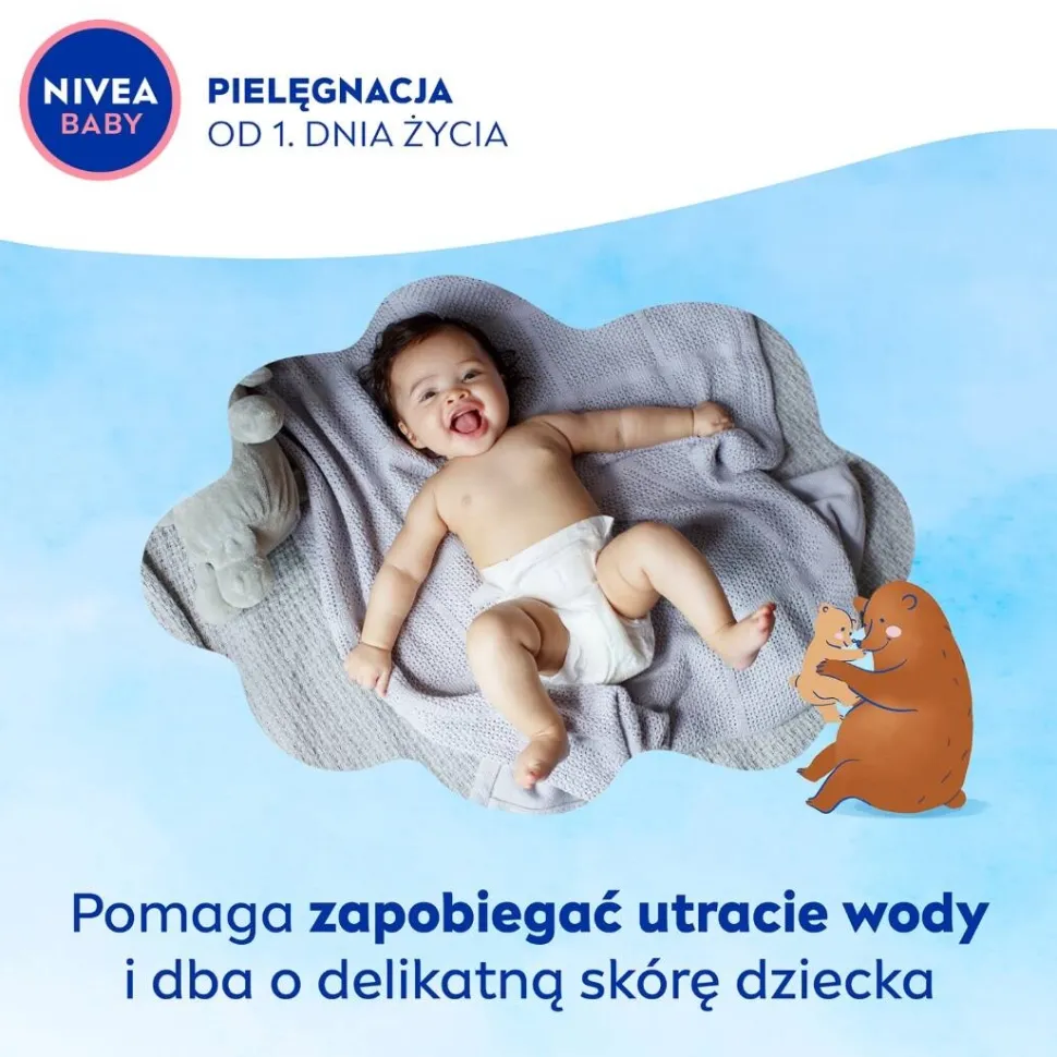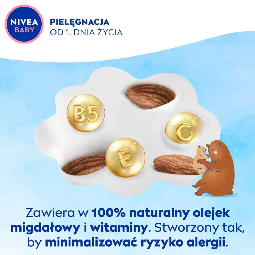 Odkryj NIVEA BABY Krem Pielęgnacyjny do twarzy i ciała, który nie tylko pomaga zapobiegać utracie wody, chroniąc skórę przed wysuszeniem, ale także chroni i wzmacnia skórę dziecka, wspierając jej naturalny proces rozwoju od 1. dnia życia. Zawiera w 100% naturalny olejek migdałowy i witaminy B5, C i E. Stworzony tak, aby minimalizować ryzyko alergii**.