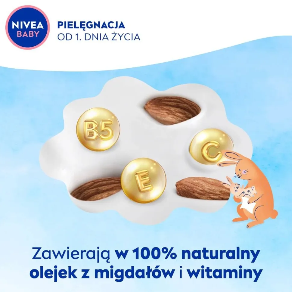 Odkryj NIVEA BABY Chusteczki Soft & Cream, które nie tylko łagodnie oczyszczają oraz pielęgnują, ale także pomagają chronić i wzmacniają skórę dziecka, wspierając jej naturalny proces rozwoju od 1. dnia życia. Zawierają w 100% naturalny olejek z migdałów i witaminy B5, C i E, wykonane są w 100% z włókien roślinnych. Produkt rekomendowany przez Instytut Centrum Zdrowia Matki Polki, a jego tolerancja dla delikatnej i wrażliwej skóry niemowląt i dzieci została potwierdzona dermatologicznie. Stworzone tak, aby minimalizować ryzyko alergii*. Formuły są łagodne i dbają o delikatną skórę dziecka i naszą planetę. Formuła jest wegańska, biodegradowalna** i nie zawiera mikroplastiku***.