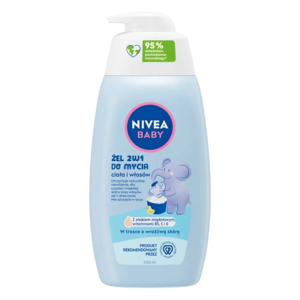 Odkryj NIVEA BABY Żel 2w1 do mycia ciała i włosów, który nie tylko łagodnie myje ciało i włosy, ale także pomaga utrzymać naturalne nawilżenie oraz chroni i wzmacnia skórę dziecka, wspierając jej naturalny proces rozwoju od 1. dnia życia. Zawiera w 100% naturalny olejek migdałowy i witaminy B5, C i E. Stworzony tak, aby minimalizować ryzyko alergii**. Produkt rekomendowany przez Instytut Centrum Zdrowia Matki Polki, a jego tolerancja dla delikatnej i wrażliwej skóry niemowląt i dzieci jest potwierdzona dermatologicznie. Formuły są łagodne i dbają o delikatną skórę dziecka i naszą planetę. Formuła jest wegańska, biodegradowalna^ i nie zawiera mikroplastiku^^.
