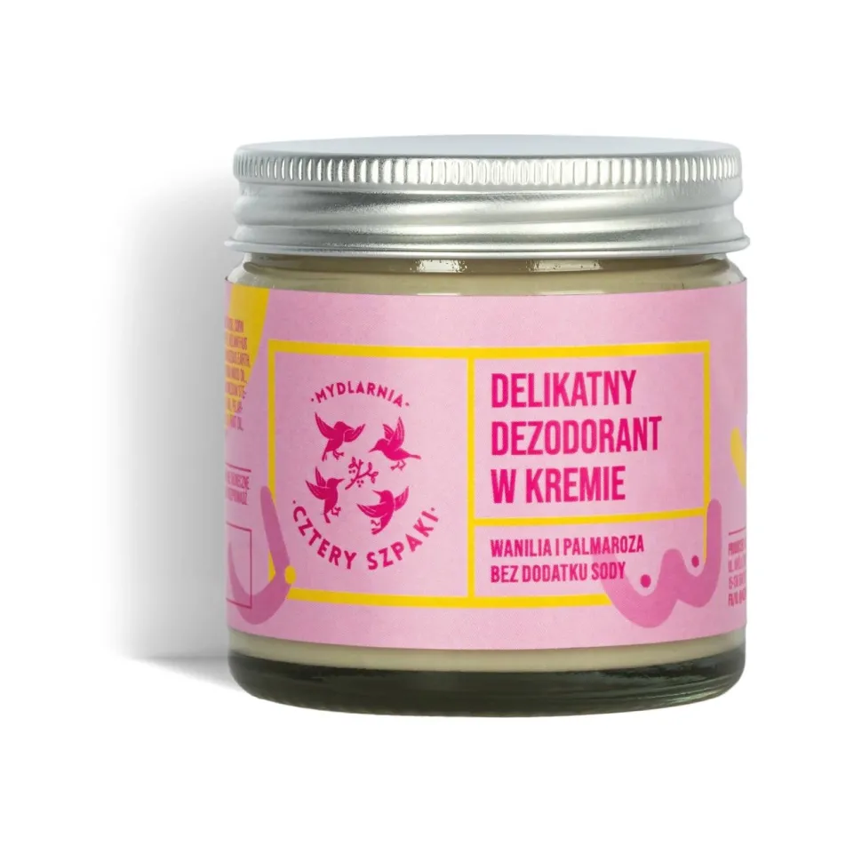Dezodorant w kremie od Czterech Szpaków to naturalna, ekologiczna i zdrowsza alternatywa dla antyperspirantu. Produkt skutecznie pochłania wilgoć, niweluje nieprzyjemny zapach i zapewnia uczucie komfortu, jednak robi to w zgodzie z naturą, nie blokując do zera niezbędnego ciału procesu, jakim jest pocenie. Delikatna wersja bez dodatku sody będzie idealnym wyborem dla tych, którzy borykają się z problemem skóry wrażliwej, skłonnej do podrażnień i alergii. Deo Wanilia i Palmaroza to wyjątkowo miły dla nosa autorski blend zapachowy – świeże nuty lawendy mieszają się tu z kwiatowymi akcentami w postaci palmarozy i geranium w towarzystwie ciepłej i otulającej wanilii.