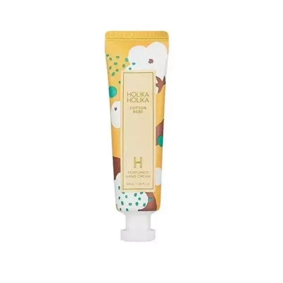 Cotton Bebe Perfumed Hand Cream to krem do rąk stworzony przez markę Holika Holika. Ekstrakt z bawełny łagodzi podrażnioną skórę, odżywia i wygładza oraz pozostawia niepowtarzalny aromat.