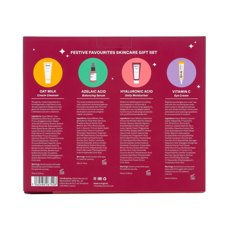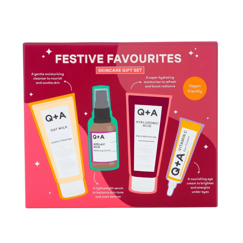 Zestaw prezentowy Q+A – czyli ulubieńcy do pielęgnacji twarzy, którzy sprawią, że skóra nabierze promiennego blasku i zdrowego wyglądu w tym wyjątkowym, świąteczno-karnawałowym okresie.Zestaw idealnie sprawdzi się jako prezent dla przyjaciela, mamy, cioci… lub siebie samej (samego)! W zestawie znajdziesz bestsellerowe produkty Q+A, czyli pełną pielęgnację na wszystkie – również te nieświąteczne – dni.