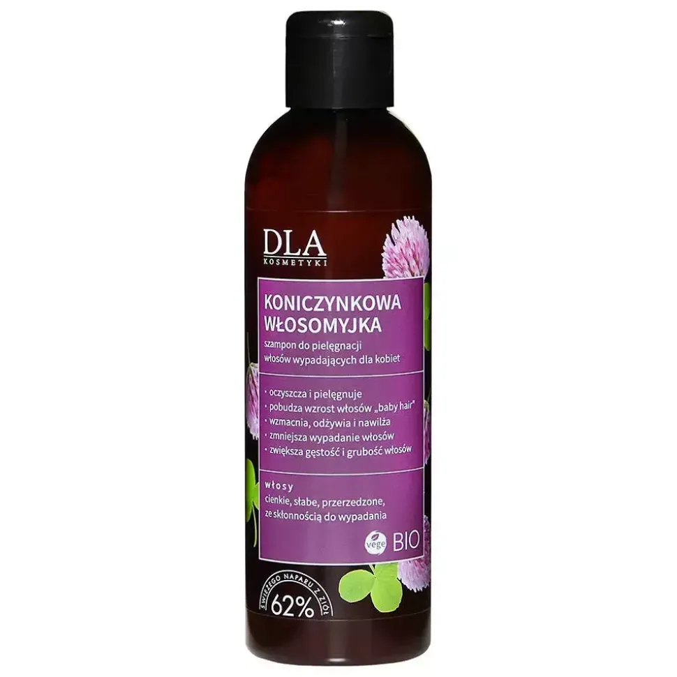 - Koniczyna czerwona – typowo kobieca roślinka. W medycynie ludowej stosowana do wcierania w skórę głowy w celu pobudzenia włosów do wzrostu. Zmniejsza wypadanie włosów spowodowane zaburzeniami hormonalnymi. Dodatkowo koniczyna ma w swoim składzie substancje przeciwutleniające, które chronią przez wolnymi rodnikami.