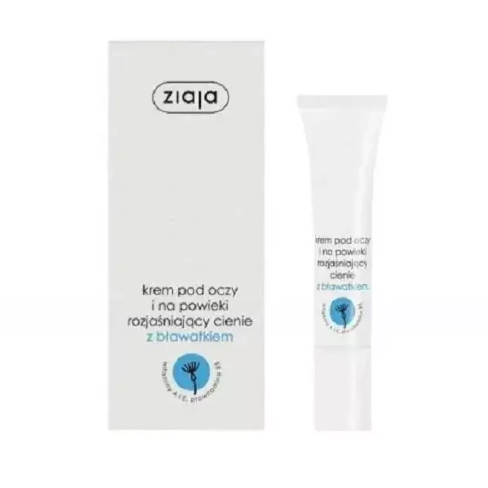 Rozjaśniający krem pod oczy i na powieki od marki Ziaja. Na bazie ekstraktu z bławatka.