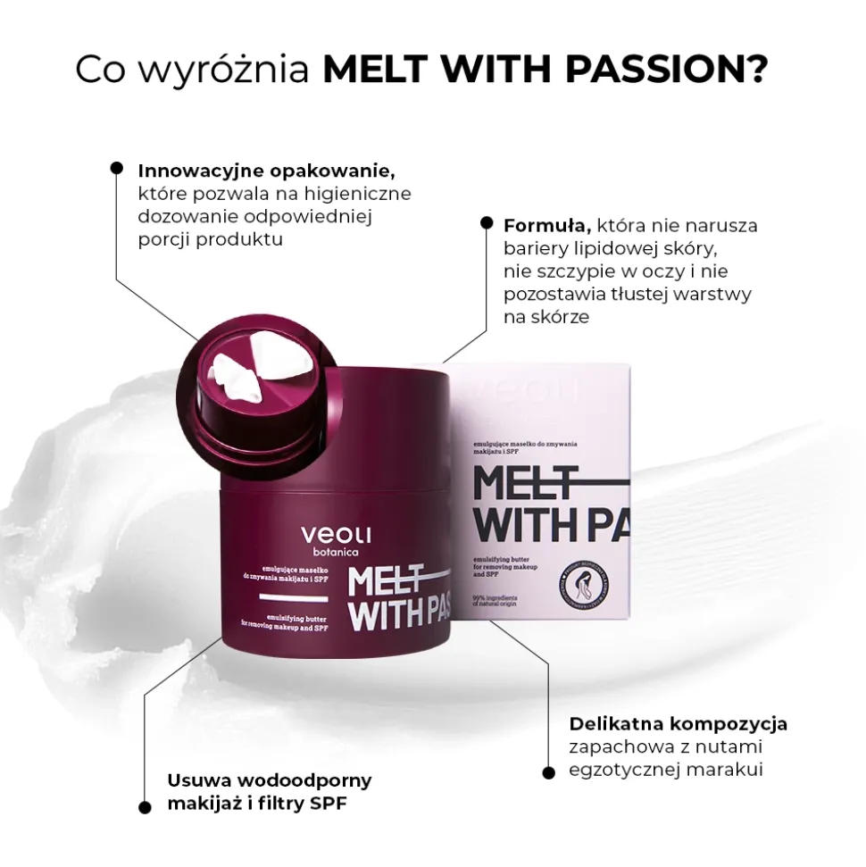 Najwyższy czas, abyś poznała emulgujące masełko MELT WITH PASSION o nutach egzotycznej marakui, które rozbudzi zmysły i zapewni Twojej skórze naturalną pielęgnację już na etapie oczyszczania! #youwillbeobsessed