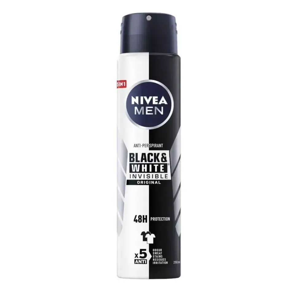 NIVEA MEN Black&White Invisible Original Antyperspirant to produkt, który zapewni Ci skuteczną i niezawodną ochronę przed poceniem się, bez ryzyka pobrudzenia Twoich ulubionych ubrań. Zapewnia ochronę 5w1 i chroni przed nieprzyjemnym zapachem, poceniem, żółtymi plamami, białymi śladami oraz przed podrażnieniami. Antyperspirant nie pozostawia żółtych plam na białych ubraniach ani białych śladów na czarnych. Unikalna formuła chroni Cię przed nadmiernym poceniem się przez 48 godzin, jednocześnie pielęgnując Twoją skórę. Męskie, klasyczny zapach zapewnia uczucie świeżości. Jego łagodność dla skóry została potwierdzona dermatologicznie.