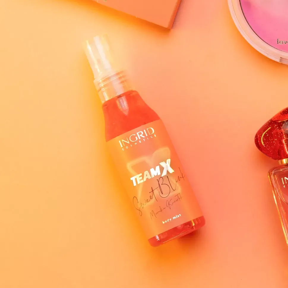 Orzeźwiająca, energetyzująca i zawsze pod ręką – mgiełka do ciała Ingrid Sweet Blink to Twój nowy stały element wyposażenia torebki. Świeży, cytrusowy aromat świetnie zastąpi ciężkie perfumy – zwłaszcza w ciepłe i upalne dni. Zapach pobudzi Twoje zmysły, a delikatne błyszczące drobinki dodadzą skórze świetlistego wyglądu. Seria powstała we współpracy z TEAM X – podkreśl z nią swój niepowtarzalny charakter.