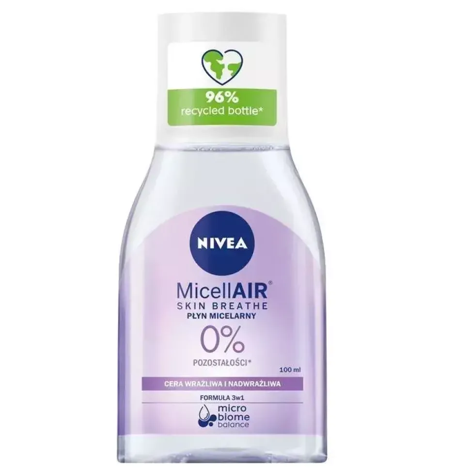 NIVEA MicellAIR® SKIN BREATHE PIELĘGNUJĄCY PŁYN MICELARNY do cery wrażliwej i nadwrażliwej zawiera formułę 3w1 z pantenolem i olejkiem z pestek winogron:
