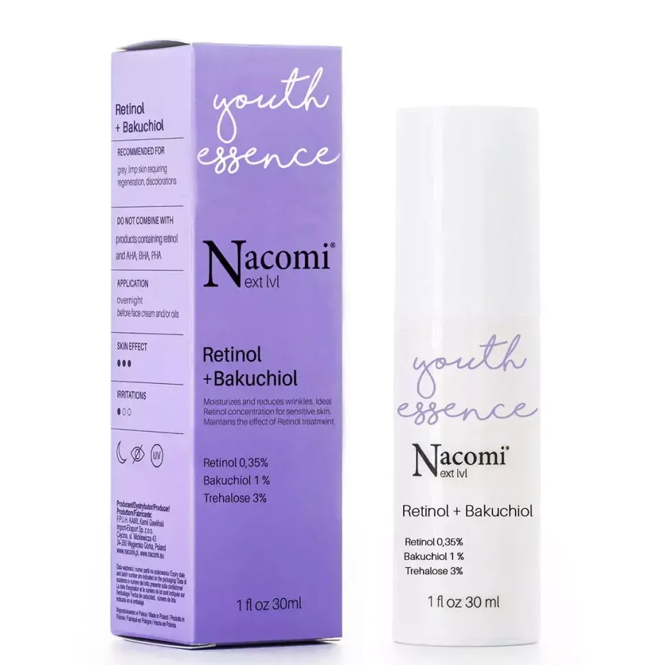 Przeciwstarzeniowe serum o optymalnym stężeniu retinolu. Idealne dla podtrzymania efektu po kuracji retinolem. Doskonałe do cery wrażliwej i skłonnej do podrażnień przy jego wyższej zawartości oraz dla osób, które zaczynają budować tolerancję na ten składnik. Redukuje zmarszczki oraz poprawia napięcie skóry. Serum wzbogacone o trehalozę utrzymuje prawidłowy poziom nawilżenia cery, zwiększa jej elastyczność i wygładza drobne zmarszczki. Zawarty bakuchiol potęguje działanie przeciwzmarszczkowe, a także zwiększa ilość fibroblastów odpowiedzialnych za produkcję kolagenu i elastyny.