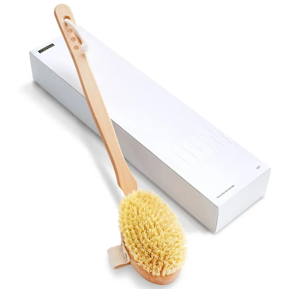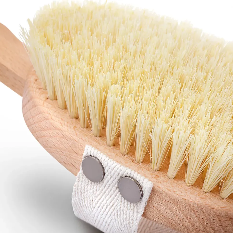 Szczotka do masażu ciała na sucho z odpinanym kijem, który ułatwi masaż pleców i trudno dostępnych miejsc na ciele.Wykonana metodą rzemieślniczą z naturalnego, olejowanego drewna bukowego.Ręcznie gęsto nabita naturalnym włóknem kaktusa agawy. Bawełniany uchwyt na dłoń ułatwia wykonywanie precyzyjnych ruchów.