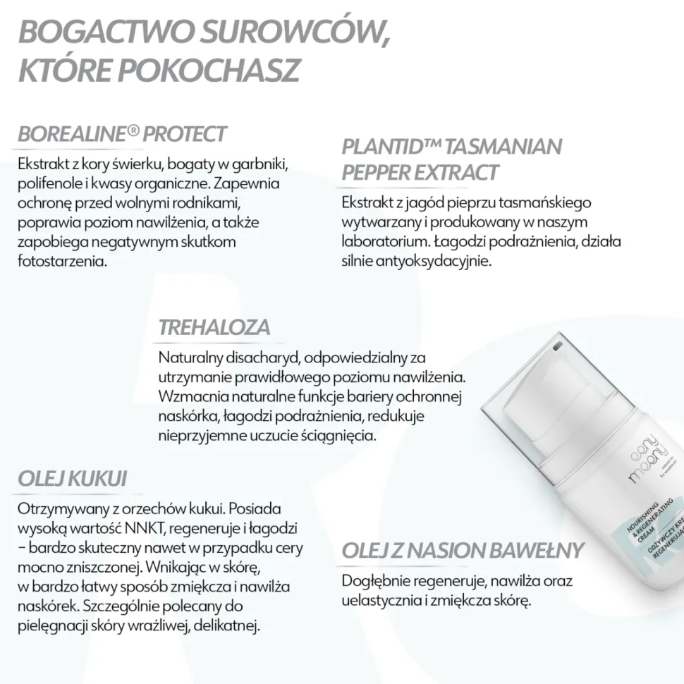 Bogata formuła kremu regenerującego łączy moc składników aktywnych, które wzmacniają skórę i chronią przed szkodliwym działaniem czynników zewnętrznych. Ekstrakt z kory świerku BOREALINE® PROTECT skutecznie neutralizuje wolne rodniki, poprawia poziom nawilżenia i zapobiega fotostarzeniu. PLANTID™ TASMANIAN PEPPER EXTRACT, pozyskiwany w laboratorium z jagód pieprzu tasmańskiego, działa silnie antyoksydacyjnie i skutecznie łagodzi podrażnienia.