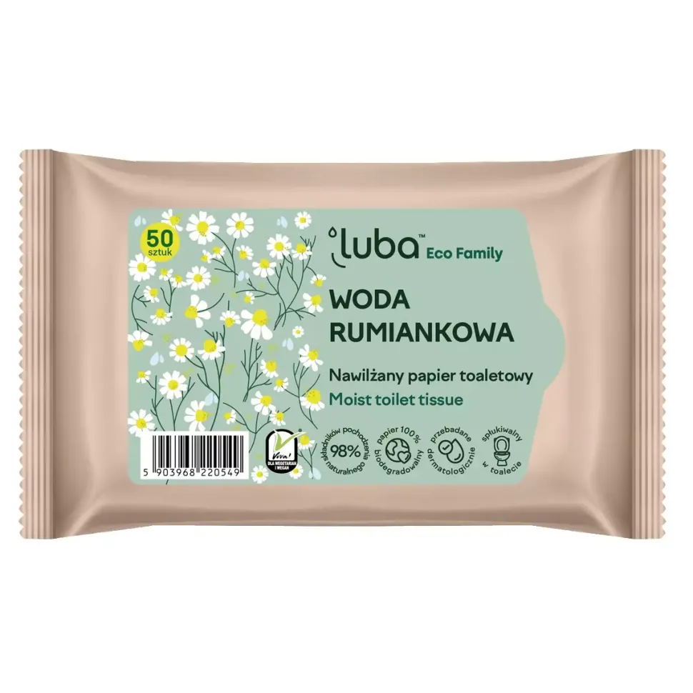 Nawilżany papier toaletowy z serii Luba Eco Family to jedna z trzech wersji nowych papierów toaletowych oferowanych przez polską markę Luba. Ekologiczny papier toaletowy może być spłukiwany w toalecie, a jego formuła zawiera aż 98% składników pochodzenia naturalnego.