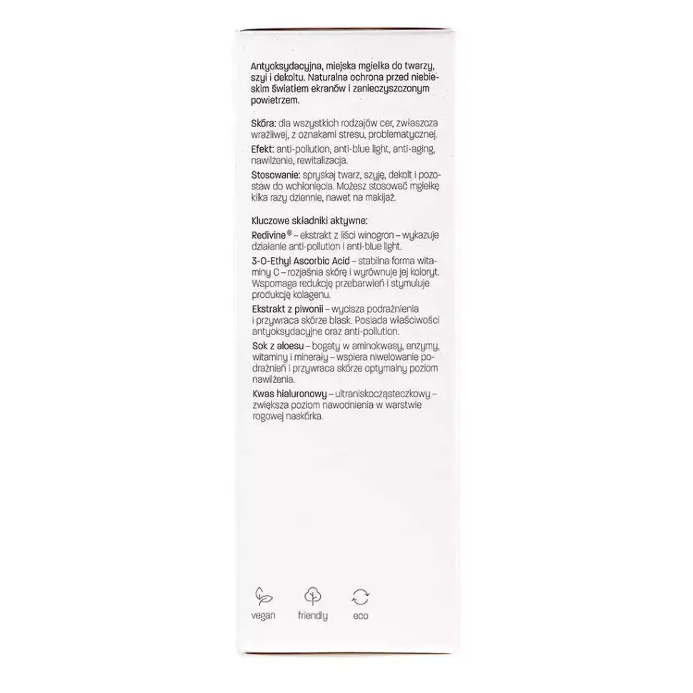 - Redivine® — ekstrakt z liści winogron — wykazuje działanie anti-pollution i anti blue-light.