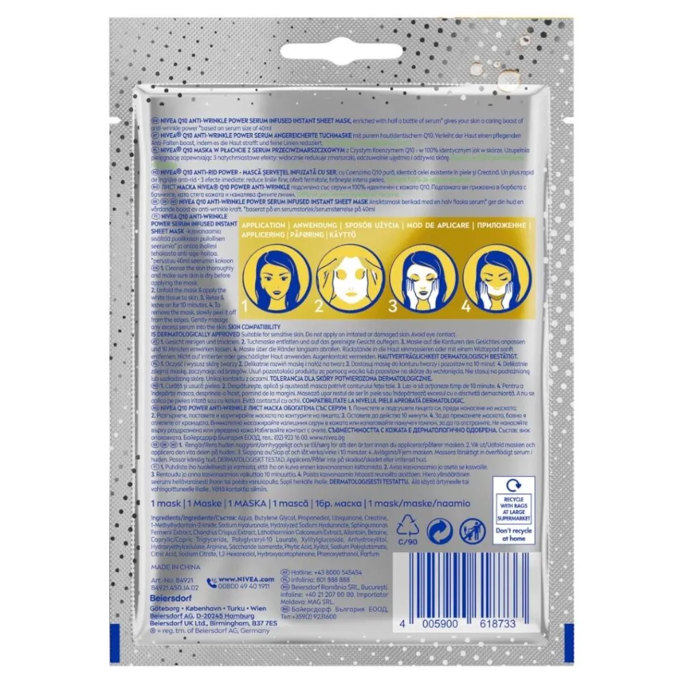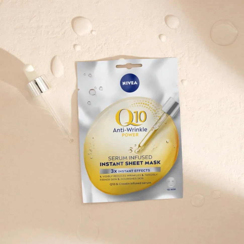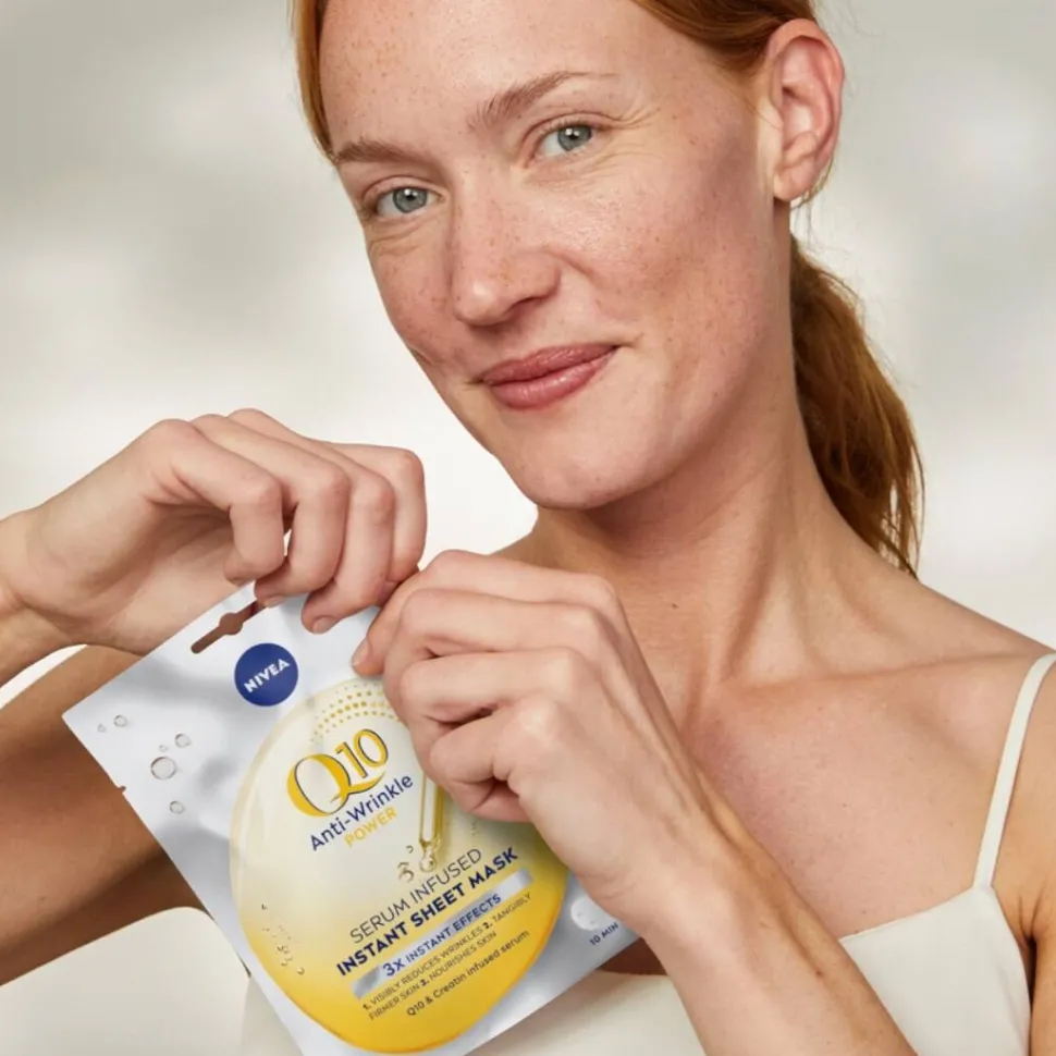 NIVEA® Q10 MASKA W PŁACHCIE NASĄCZONA JEST SERUM PRZECIWZMARSZCZKOWYM, które zawiera w 100% identyczny jak w skórze Czysty Koenzym Q10 i Kreatynę.