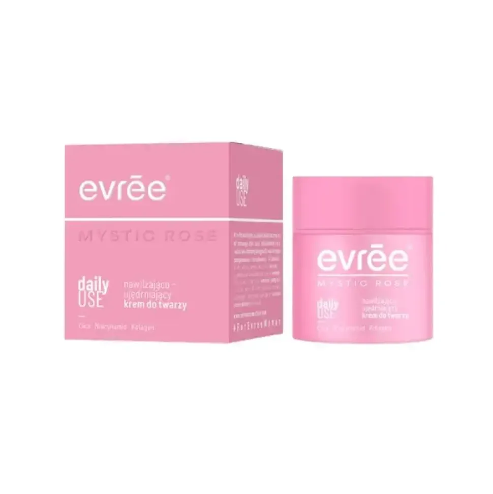 Evree Mystic Rose Daily Use Nawilżająco-ujędrniający krem do twarzy Działaniu nawilżająco-ujędrniającym, stworzony z myślą o świadomej pielęgnacji skóry. Kosmetyk wspiera naturalne procesy regeneracyjne, jednocześnie chroniąc cerę przed negatywnym wpływem czynników zewnętrznych, takich jak zanieczyszczenia, promieniowanie UV czy stres oksydacyjny. Dzięki regularnemu stosowaniu kremu skóra odzyskuje naturalny blask, staje się bardziej elastyczna i gładsza w dotyku.