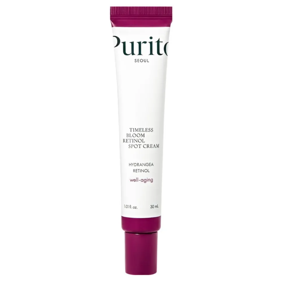 Purito Seoul – Timeless Bloom Retinol Spot Cream – krem przeciwzmarszczkowy przeznaczony do stosowania miejscowego lub na całą twarz z pobudzającym syntezę kolagenu, napinającym i ujędrniającym retinolem w stężeniu 0.1%. Połączenie z bakuchiolem o działaniu anti-aging i antyoksydacyjnym gwarantuje skuteczne działanie redukujące ilość zmarszczek i wygładzające. Formuła wzbogacona o ekstrakt z liści Hortensji Jeju, która ogranicza stres oksydacyjny, łagodzi i wzmacnia naturalne funkcje obronne skóry. Ekstrakt z białej herbaty zapewnia działanie przeciwzapalne i przeciwobrzękowe, zmniejszając skutki drażniące wynikające ze stosowania kremu z zawartością retinolu. Kwas hialuronowy nawilża oraz napina skórę. Krem rekomendowany dla skór wiotkich i dojrzałych.