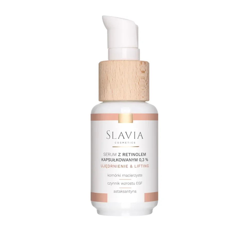 Serum z retinolem kapsułkowanym 0,3% to prawdziwy przełom w pielęgnacji przeciwstarzeniowej, ale i nie tylko! Chcesz osiągnąć wspaniałe efekty, jakie gwarantuje osławiony retinol? Obawiasz się jednak podrażnienia skóry, które tak często występuje na początku używania zwykłego retinolu? Serum z retinolem od Slavia cosmetics przychodzi z odpowiedzią! Dzięki technologii kapsułkowania, czyli zamknięciu cząsteczek retinolu w mikro kapsułkach, jest on uwalniany w głębszych warstwach skóry. Pozwala to maksymalnie zredukować ryzyko podrażnień, a przy tym zachować najwyższą skuteczność i trwałość. Dodatek innowacyjnego peptydu zawartego w surowcu Reneseed™ daje efekt synergii wzmacniając dobroczynne działanie retinolu i dodatkowo go stabilizując. Czynnik wzrostu naskórka zawarty w Epitensive™ silnie pobudza procesy regeneracyjne skóry, a także widocznie redukuje widoczność zmarszczek. MAJESTEM™, czyli surowiec pełen w komórki macierzyste z szarotki alpejskiej, skutecznie zapobiega stresowi oksydacyjnemu, a przy tym poprawia napięcie skóry. Wyraźnie liftinguje skórę szyi oraz poprawia kontur policzków. Astaksantyna to jeden z najsilniejszych przeciwutleniaczy, działa antyoksydacyjne, wymiatając wolne rodniki i niwelując negatywne skutki ich działania. To właśnie ona jest odpowiedzialna za łososiowy kolor serum. Dodatkowo za nawilżenie skóry odpowiada niskocząsteczkowy kwas hialuronowy, pozyskany w technologii degradacji enzymatycznej. Głęboko nawilża i wypełnia skórę. Jeśli chcesz kompleksowo zadbać o swoją skórę, to serum jest właśnie dla Ciebie. Nie tylko zapobiega oznakom starzenia, ale również spłyca dotychczasowe zmarszczki i linie. Dodatkowo wspomaga walkę z niedoskonałościami skóry, reguluje wydzielanie sebum i wyrównuje koloryt skóry. Formuła serum zapewnia niskie ryzyko wystąpienia podrażnień, a przy tym jest wysoce stabilna. Pamiętaj jednak, że efekty stosowania retinolu widoczne są po około 3 miesiącach regularnego aplikowania.