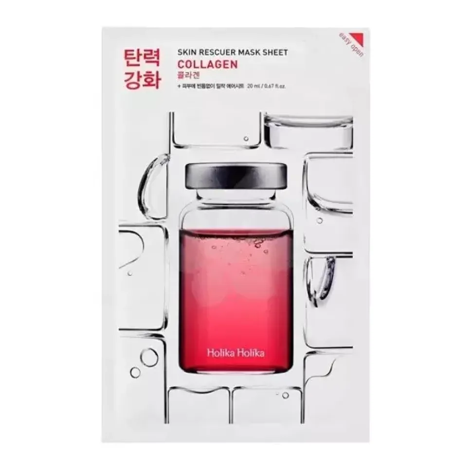 Holika Holika – Skin Rescuer Mask Sheet – Collagen – liftingująca maska w płachcie wzbogacona o hydrolizowany kolagen, który przywraca elastyczność, wygładza i zmiękcza skórę. Dzięki zawartości kwasu hialuronowego oraz argininy skóra będzie dogłębnie nawilżona oraz odżywiona. Produkt zawiera także ekstrakt z wąkroty azjatyckiej i ekstrakt z rumianku, dzięki którym podrażnienia będą ukojone, a stany zapalne wyciszone.