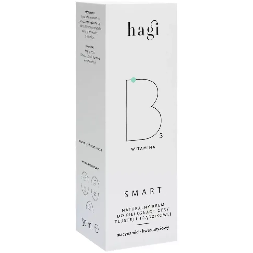 Krem do cery z niacynamidem Hagi SMART to kompozycja zaawansowanych składników wspomagających regulację wydzielania sebum oraz zapewniających prawidłowy poziom nawilżenia wymagającej skóry. Bisabolol oraz olej krokoszowy koi stany zapalne wywołane trądzikiem. Kompleks roślinny z zielonej herbaty, jaśminu i brzoskwini zapewnia komfortowe wykończenie i szybkie wchłanianie kremu.