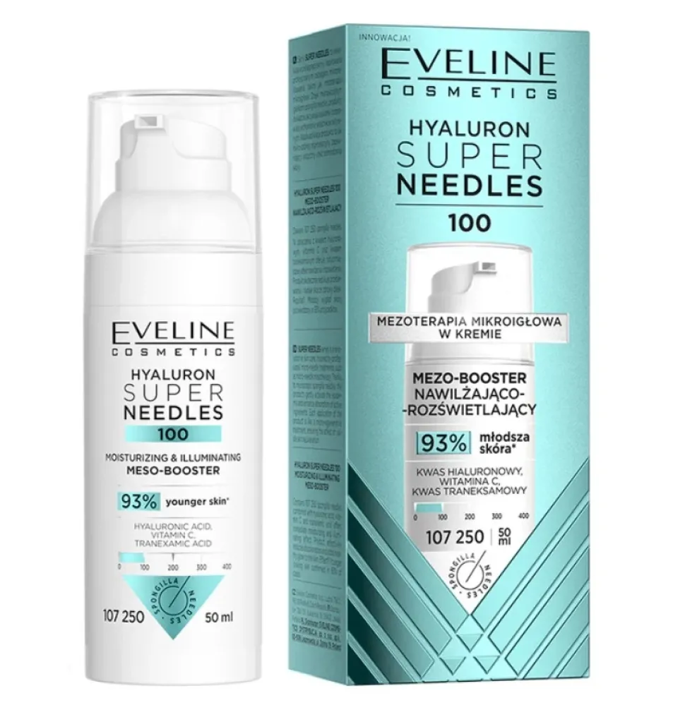 Hyaluron Super Needles 100 Mezo-booster nawilżająco – rozświetlający to lekki, kremowy booster inspirowany technologią mikronakłuwania, który intensywnie nawilża i rozświetla cerę. Wspiera redukcję przebarwień i wyrównuje koloryt skóry. Widocznie poprawia wygląd cery już po pierwszym użyciu. Idealny dla skóry zmęczonej, poszarzałej, pozbawionej blasku, skłonnej do przebarwień.