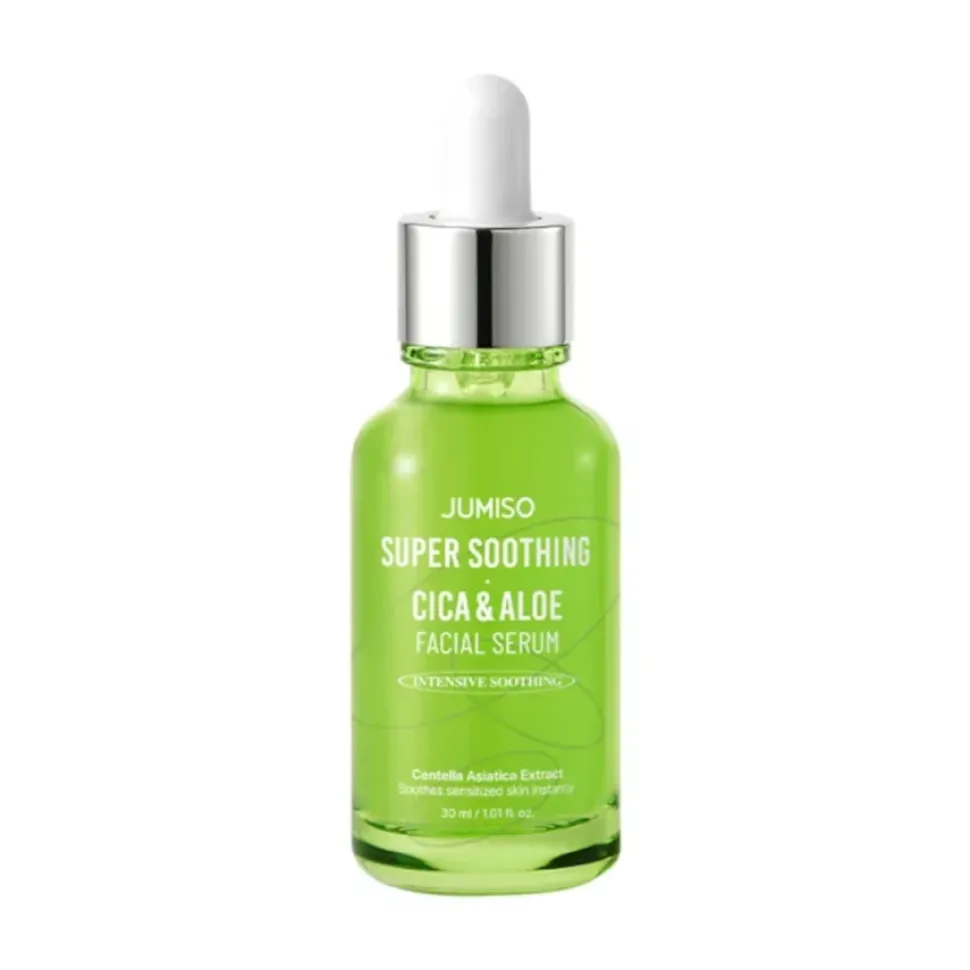 Jumiso Super Soothing Cica Aloe Facial Serum 30ml Silnie skoncentrowane serum nawilża i koi skórę narażoną na niekorzystne skutki wahań temperatury, zanieczyszczonego powietrza i codziennych stresorów. Produkt zawiera 41% ekstraktu z Centella asiatica – silnego składnika mającego na celu odbudowę skóry oraz 31% ekstraktu z liści Aloe Vera, który jest w stanie dogłębnie nawilżyć skórę i odbudować jej mechanizmy obronne. Kompleks 7 rodzajów kwasu hialuronowego zapewnia zatrzymanie wilgoci w skórze w ciągu dnia, a kompleks 17 rodzajów aminokwasów chroni barierę skóry i poprawia jej elastyczność.