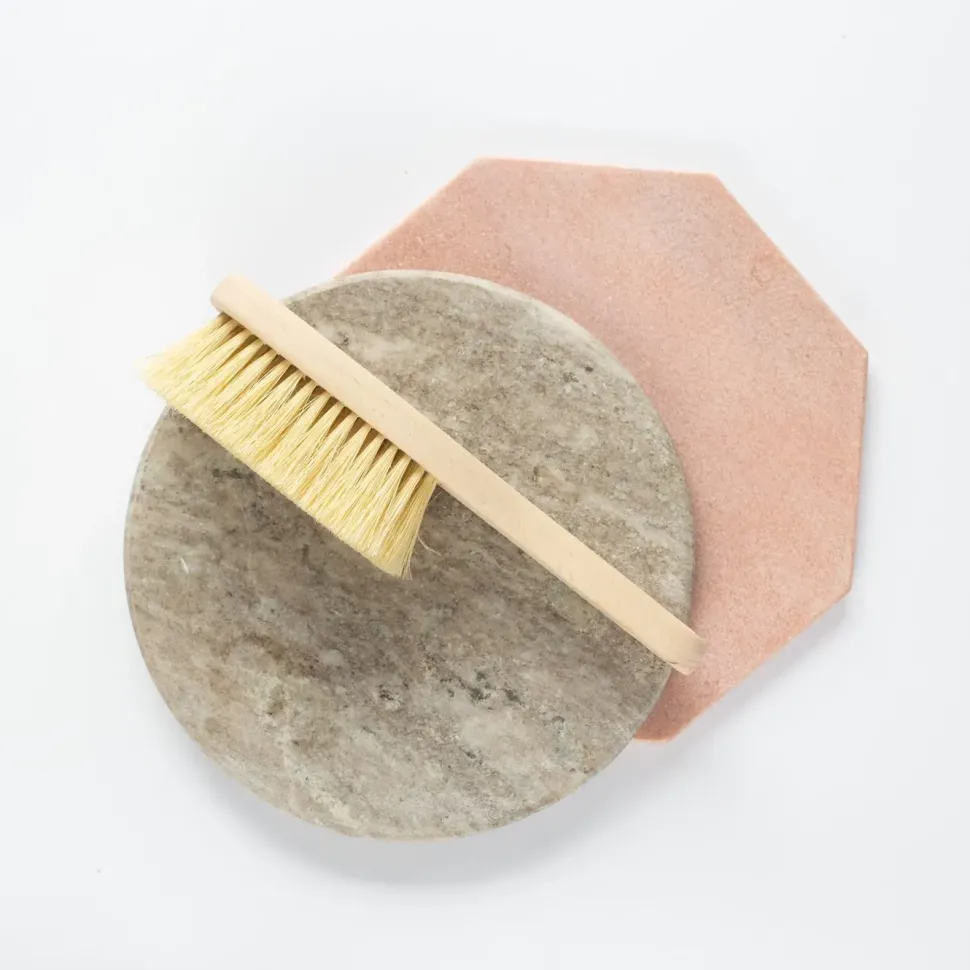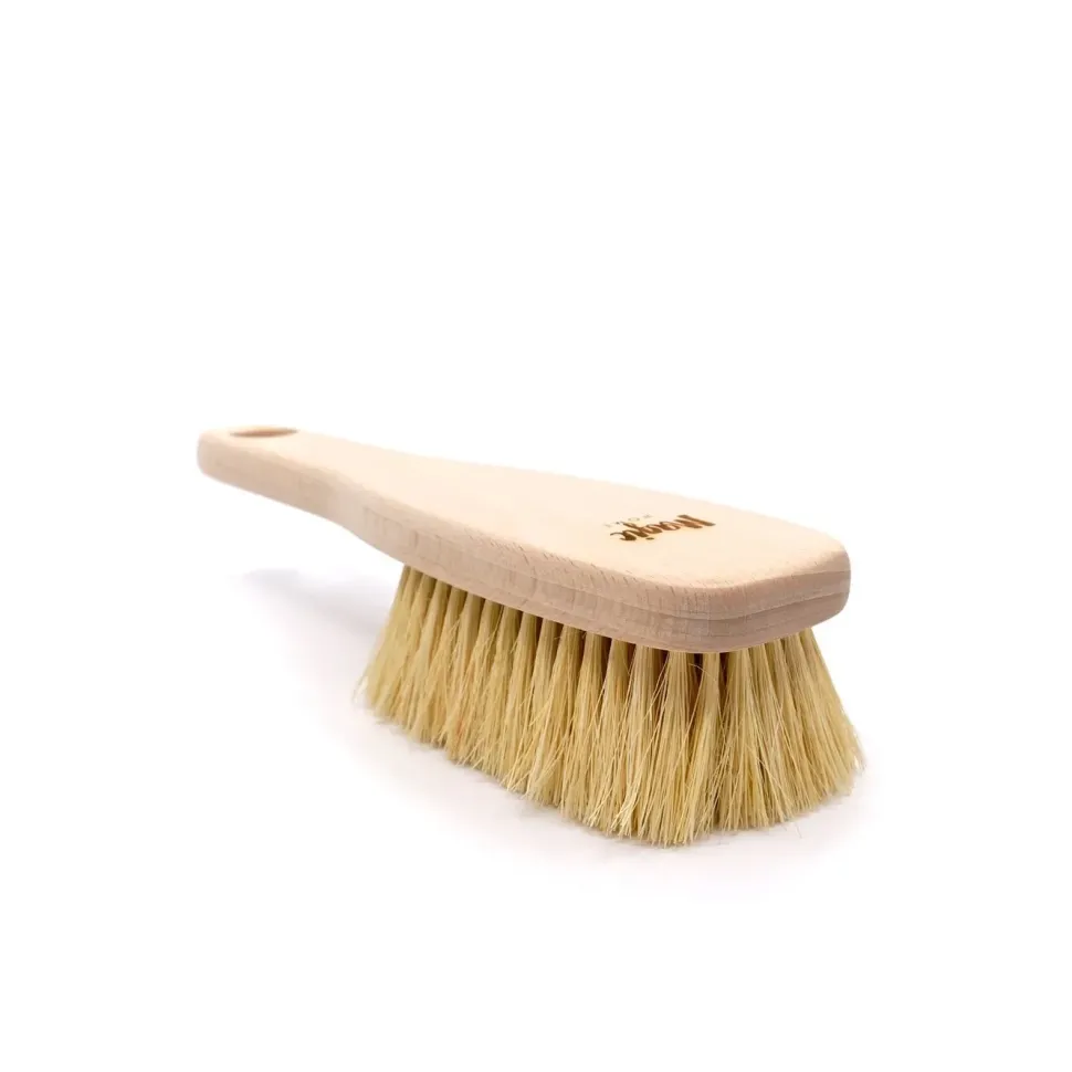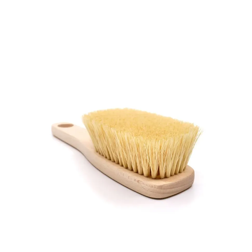 Szczotka do masażu ciała z rączką wykonana z włókna roślinnego – agawy (tampico) oraz z drewna bukowego.