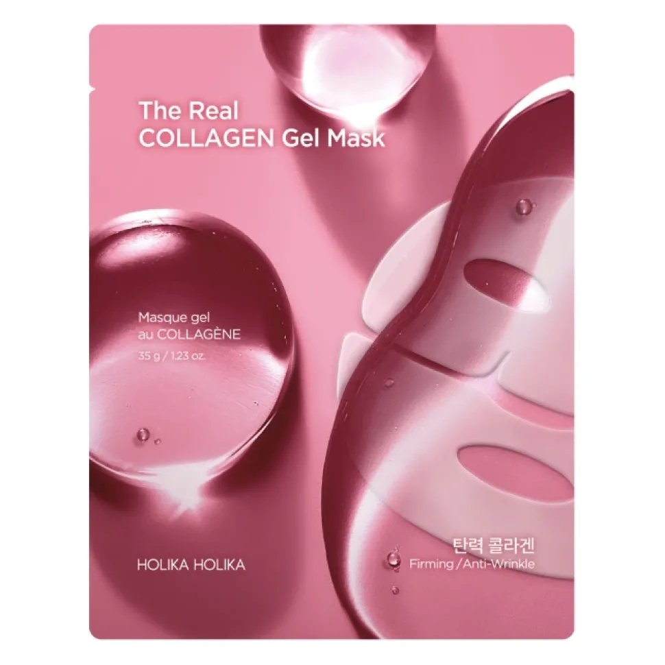 Holika Holika – The Real Gel Mask Collagen – hydrożelowa maska składająca się z dwóch części o kompleksowym działaniu korzystnym dla cer dojrzałych, wiotkich i suchych. Działanie przeciwzmarszczkowe, ujędrniające i napinające zawdzięcza hydrolizowanemu kolagenowi, ekstraktowi z kolagenu i kompleksowi 6 peptydów. Dodatek niacynamidu wspiera prawidłowe funkcjonowanie bariery naskórkowej, betaina poprawia poziom nawilżenia, a olej kokosowy odżywia i powleka skórę ochronną warstwą, która zapobiega utracie wilgoci z wnętrza skóry.