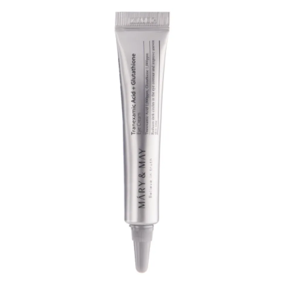 Mary&May – Tranexamic Acid + Glutathion Eye Cream – krem pod oczy stworzony z myślą o pielęgnacji zmęczonej i poszarzałej skóry wokół oczu. W składzie znajduje się skutecznie rozjaśniający przebarwienia i wyrównujący koloryt skóry kwas traneksamowy, który dba nie tylko o niwelowanie obecnych zmian, ale również zapobiega powstawaniu nowych przebarwień. Glutation – tripeptyd – niweluje plamy pigmentacyjne i działa antyoksydacyjnie, tak jak dodany do formuły niacynamid. Z kolei adenozyna uelastycznia. Obecny w składzie hialuronian sodu sprawia, że skóra wokół oczu staje się wygładzona i nawilżona. Produkt posiada jednocześnie lekką, ale i wyraźnie odżywczą konsystencję, przywraca skórze komfort od pierwszego zastosowania. Znajduje się w opakowaniu less-waste.