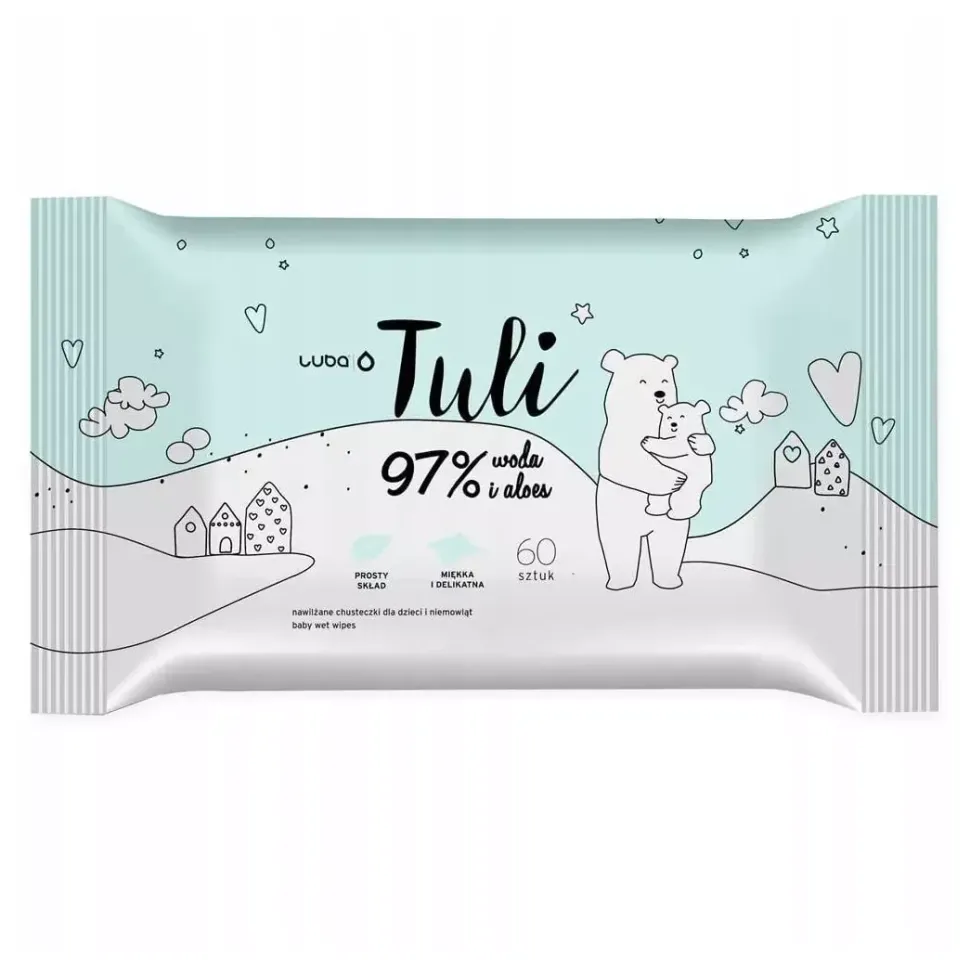 Nawilżane chusteczki dla dzieci Luba TULI to absolutna rewolucja wśród chusteczek dla dzieci i niemowląt. Opierają swoje działanie na prostym składzie formuły nawilżającej. Ich stosowanie jest bezpieczne nawet w przypadku najmłodszych dzieci. Opakowanie zawiera 60 chusteczek nasączonych w 97% wodą oraz substancjami działającymi kojąco i łagodząco na skórę dziecka.