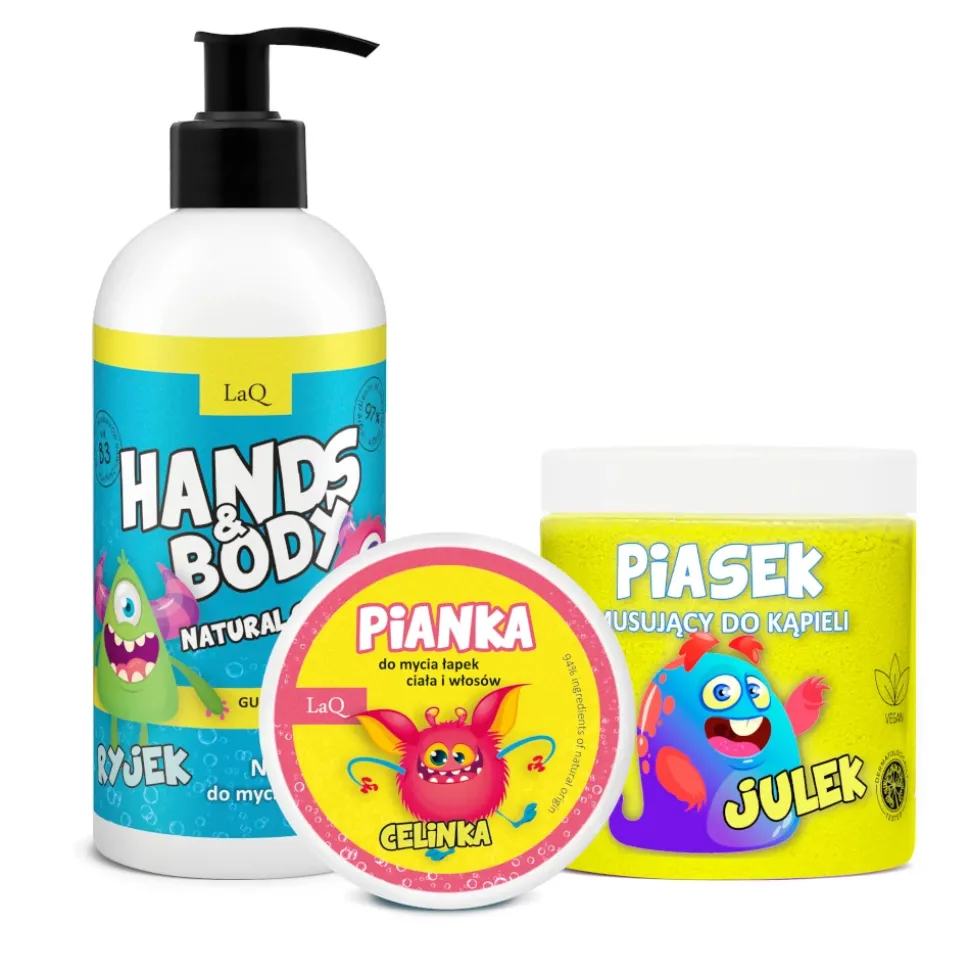 Oto ja, czyli wegański zestaw kosmetyków naturalnych dla dziecka, składający się z żelu do mycia, żółtego musującego piasku do kąpieli oraz żółtej pianki do mycia łapek. Seria ta ma odlotowy zapach gumy balonowej oraz banana. Stworzyliśmy ją specjalnie dla dzieci, z myślą o ich delikatnej skórze i miłości do kolorów.