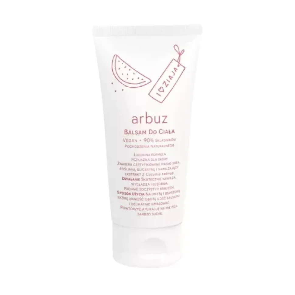 Balsam do ciała Ziaja Arbuz to wyjątkowy kosmetyk do pielęgnacji każdego rodzaju skóry. Nowoczesna formuła opiera się w 90% na składnikach pochodzenia naturalnego. Balsam został wzbogacony o certyfikowane masło shea, roślinną glicerynę i nawilżający ekstrakt z Cucumis sativus, dzięki czemu intensywnie nawilża, ujędrnia, uelastycznia i wygładza skórę.