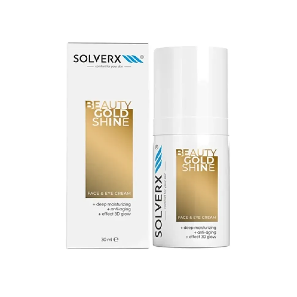 Solverx Beauty Gold Shine to krem, który doskonale dopasowuje się do każdej karnacji oraz współgra z makijażem, nadając skórze urzekający efekt. Złote refleksy w kremie sprawiają, że Twoja cera wygląda zdrowo i promiennie każdego dnia. W formule kremu Solverx znajdziesz ekstrakt z aloesu, peptydy, antraktycynę, prebiotyki, hydrolizowane białka pszenicy, wyciąg z algi brązowej, skwalan i oleje z: nasion kukui i pestek winogron.