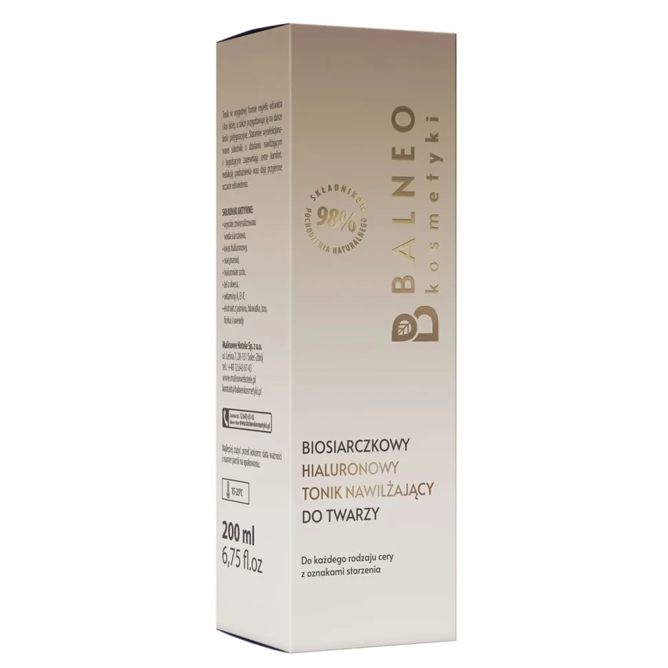 Balneokosmetyk z wodą siarczkową, kwasem hialuronowym, niacynamidem, hialuronianem sodu, żelem z aloesu, witaminami A, E i F, ekstraktem z: jaśminu, bławatka, bzu, fiołka i lawendy polecany do cery suchej i podrażnionej z oznakami starzenia.