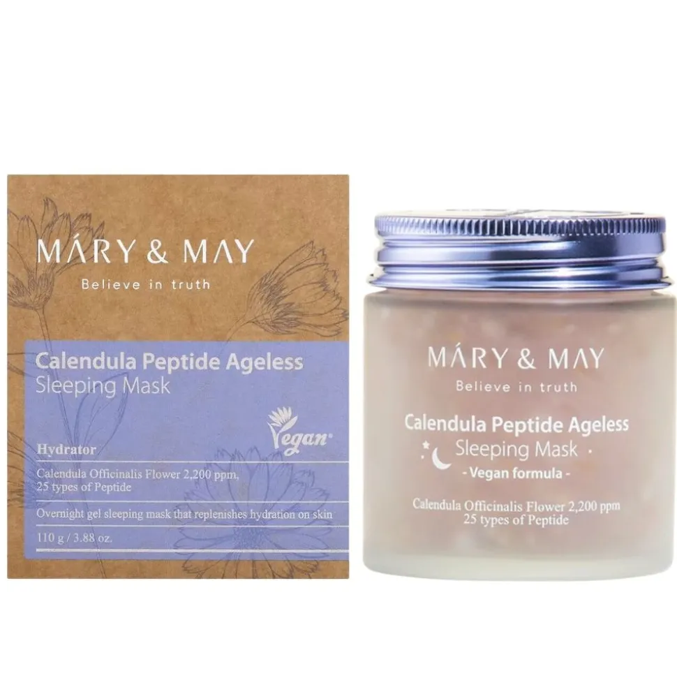 Mary & May Calendula Peptide Ageless Sleeping Mask – maseczka na noc z ekstraktem z nagietka i peptydami intensywnie nawilża, przywraca równowagę wodną, likwiduje suchość, łuszczenie, łagodzi zaczerwienienia, wygładza skórę, zwiększa jej elastyczność, napina i wzmacnia, zwiększa funkcje ochronne, chroni przed negatywnymi wpływami zewnętrznymi. Płatki nagietka w masce są delikatnie wchłaniane przez skórę, więc używaj jej z pewnością. Nałóż grubą warstwę i idź spać, aby zregenerować uszkodzoną skórę przez noc. Stymuluje syntezę kolagenu i dostarcza skórze właściwej składników niezbędnych dla zdrowia skóry, nadając jej młodszy wygląd. Kolor niebieski to naturalny kolor gwajzulenu, który delikatnie się wchłania i zasadniczo uelastycznia skórę oraz działa kojąco.