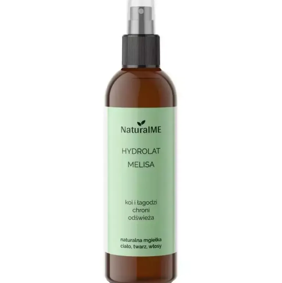 Naturalna woda z melisy otrzymywana jest w procesie destylacji kwiatów, liści i łodyg tej rośliny. Koi i łagodzi podrażnienia oraz swędzenie skóry, zmniejsza opuchliznę i zaczerwienienia. Wskazana w zwalczaniu egzemy. Wykazuje działanie antyoksydacyjne, chroni skórę przed działaniem wolnych rodników i spowalnia proces powstawania zmarszczek.
