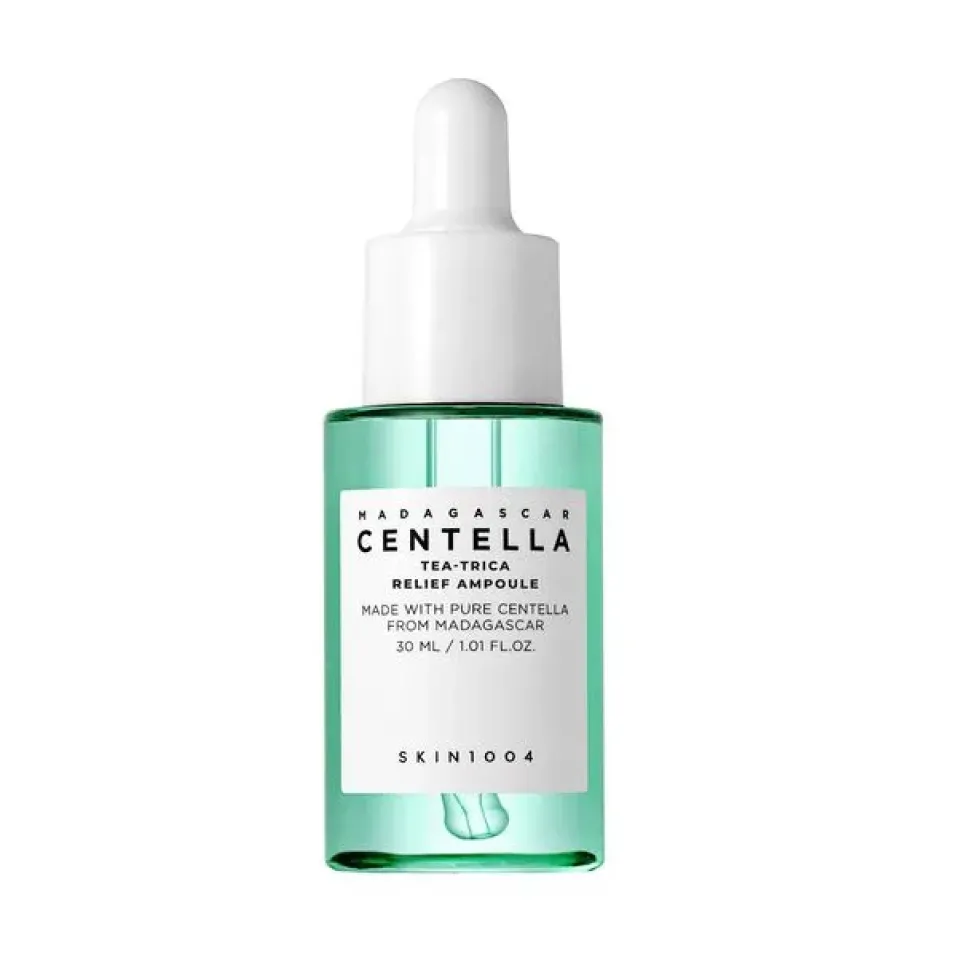 SKIN1004 – Madagascar Centella Tea-Trica Relief Ampoule – serum wspomagające zwalczanie niedoskonałości oraz wyciszające podrażnienia. Bazuje na ekstrakcie z wąkroty azjatyckiej, który działa łagodząco i regenerująco. Z kolei dodatek hydrolatu i olejku z drzewa herbacianego działa odświeżająco, przeciwtrądzikowo, przeciwzapalnie i wspomaga proces gojenia. Kompleks z sosny, w którego skład wchodzi między innymi woda cyprysowa, skutecznie wycisza stany zapalne skóry. Serum przynosi ulgę skórze.