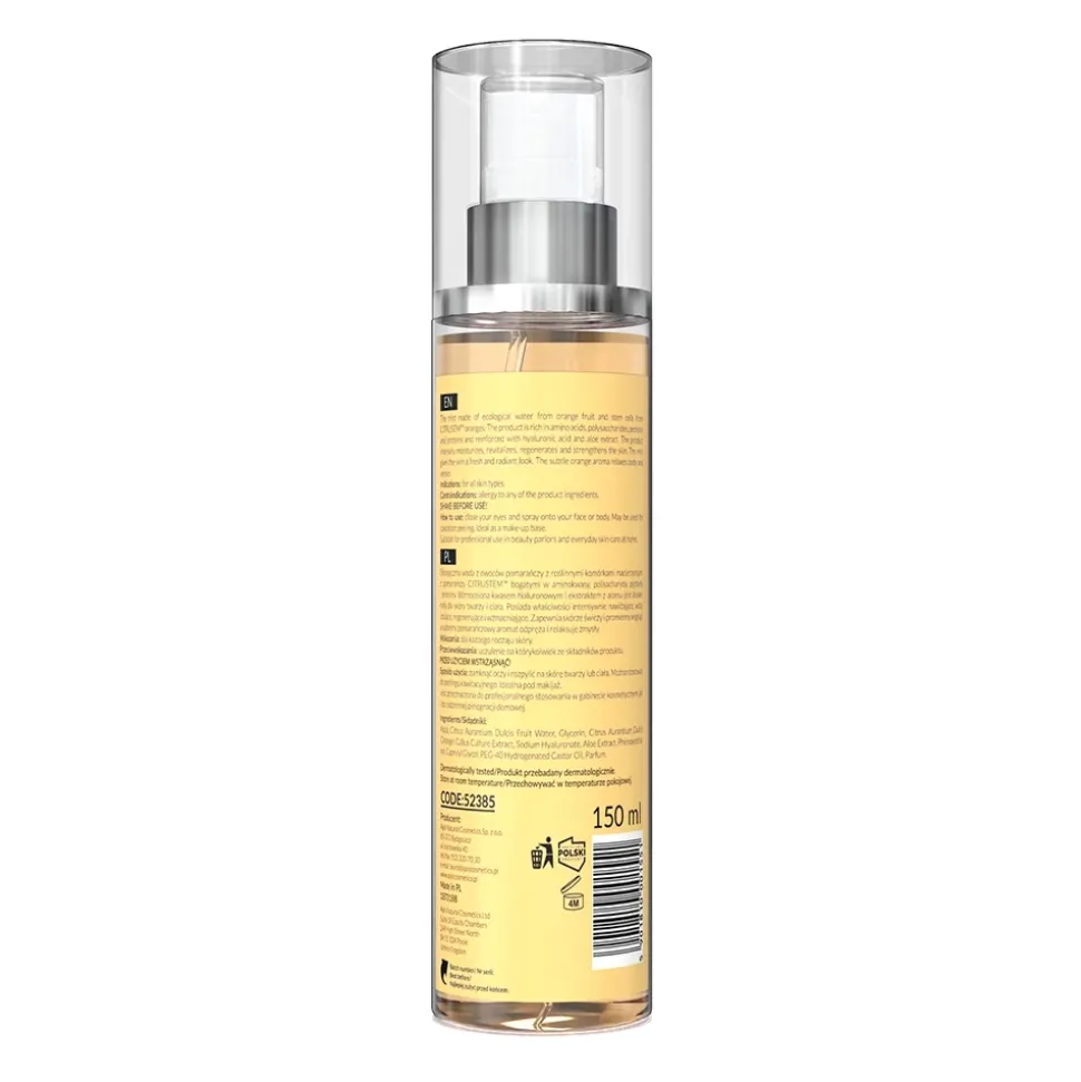 Dla każdego rodzaju cery.Ekologiczna woda z owoców pomarańczy certyfikowana przez Ecocert i roślinnymi komórkami macierzystymi z pomarańczy CITRUSEM TM. Wzmocniona kwasem hialuronowym i ekstraktem z aloesu zapewnia skórze świeży i promienny wygląd, a subtelny pomarańczowy aromat odpręża i relaksuje zmysły.