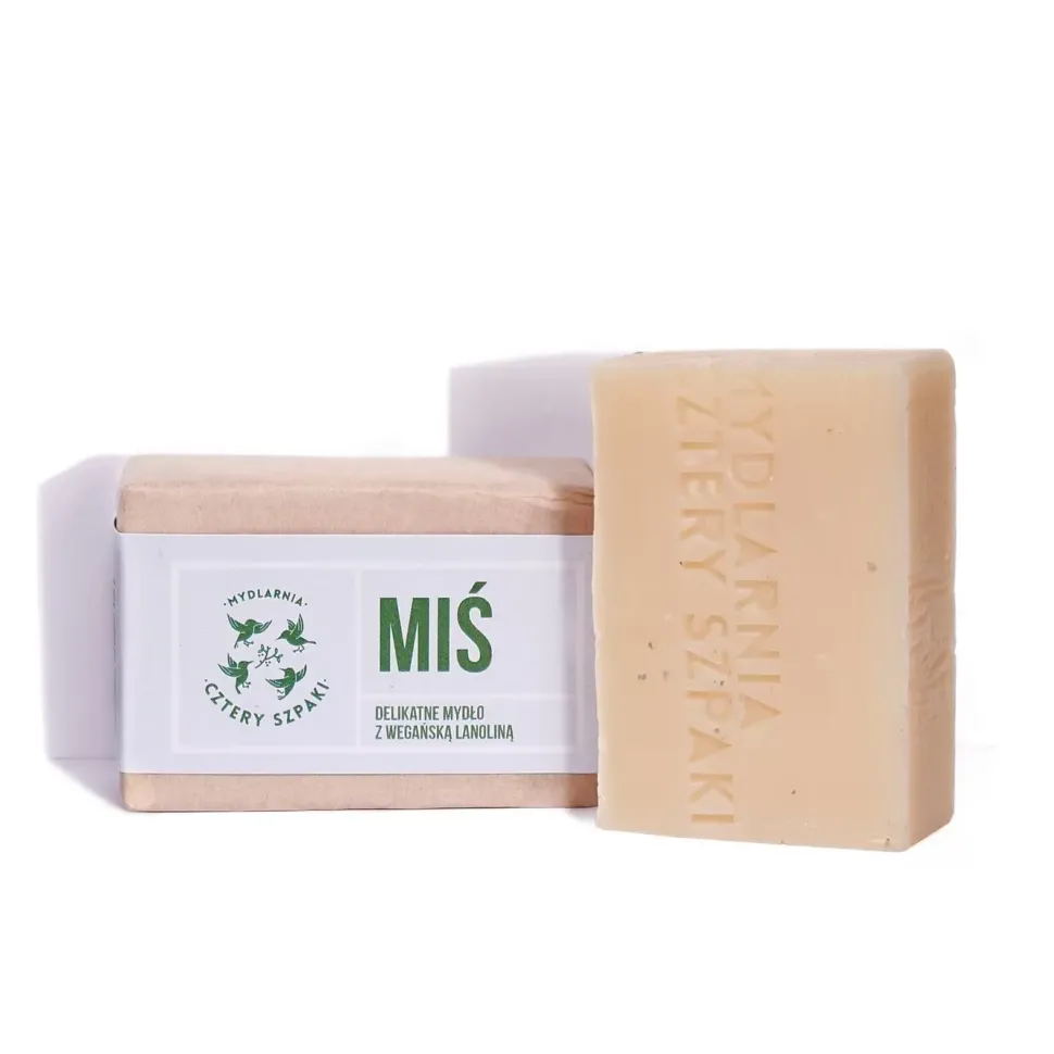 Miś, czyli najdelikatniejsza kostka od Czterech Szpaków teraz dostępna jest również w wersji stuprocentowo wegańskiej – dzięki zmianie tradycyjnej lanoliny na jej roślinny odpowiednik. Miś nie zawiera olejków eterycznych ani barwników, dzięki czemu jest mydłem klasycznym, łagodnym, stuprocentowo naturalnym – idealnie nadaje się do pielęgnacji skóry problematycznej, wrażliwej, ze skłonnością do nadmiernego przesuszania lub alergii. Misia chętnie używają osoby borykające się z problemem typu AZS i alergiami skóry. Jest również ulubieńcem dzieci i świeżo upieczonych mam.
