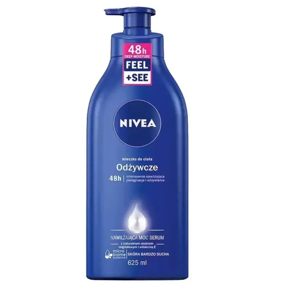 NIVEA® Odżywcze mleczko do ciała wzbogacone jest o GŁĘBOKO NAWILŻAJĄCE SERUM z naturalnym olejkiem migdałowym i witaminą E. Intensywnie odżywia przez 48h i odczuwalnie redukuje szorstkość Twojej suchej skóry – już po 1 zastosowaniu!