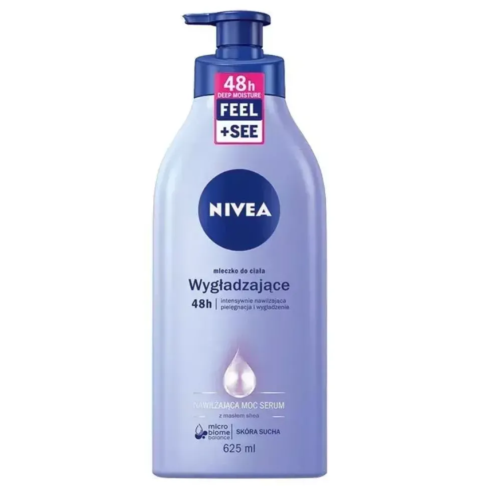 NIVEA® Wygładzające mleczko do ciała wzbogacone jest o GŁĘBOKO NAWILŻAJĄCE SERUM i drogocenne masło shea. Delikatnie otula Twoją skórę pozostawiając ją jedwabiście miękką w dotyku i intensywnie nawilżoną przez 48h – już po 1 zastosowaniu!