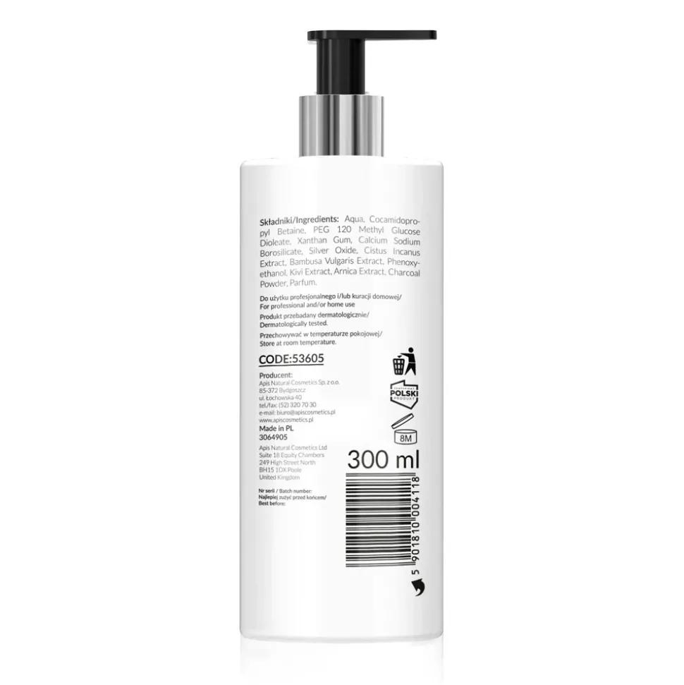 składniki (IN CI), Aqua, Cocamidopropyl Betaine, PEG 120, Methyl Glucose Dioleate, XANTHAN GUM, CAL CIUM SODIUM BOROSILICATE, Silver Oxide CIstus Incanus Extract, Bambusa Vulgaris Extract, Phonoxethanol, Kivi Extract, Arnica Extract, Charcoal Powder, Parfum