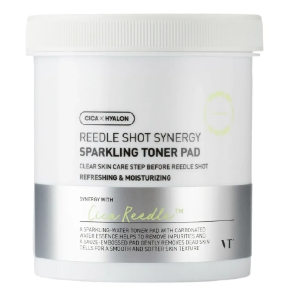 VT Cosmetics Reedle Shot Synergy Sparkling Toner Pad to tonizujące płatki do twarzy, które pomagają oczyścić skórę, usunąć zanieczyszczenia oraz zrównoważyć poziom pH. Formuła bogata w ekstrakty roślinne, takie jak wąkrota azjatycka i ekstrakt z drzewa herbacianego, skutecznie łagodzi podrażnienia i wspomaga procesy regeneracyjne skóry.