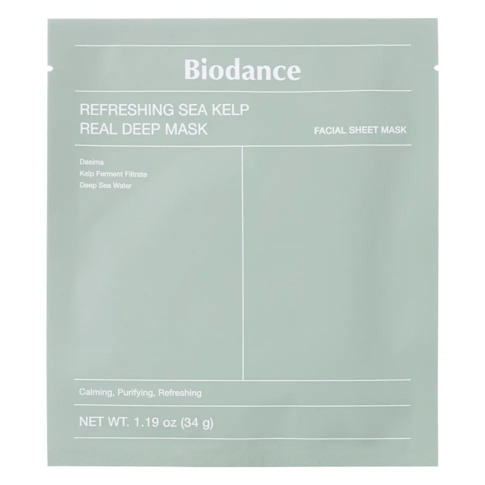Biodance – Refreshing Sea Kelp Real Deep Mask – hydrożelowa maseczka do twarzy, która składa się z dwóch części (na dolną i górną partię twarzy). Jest przeznaczona do stosowania na całą noc lub minimum 3-4 godziny. Zawarte w składzie kosmetyku fermentowane algi morskie to probiotyk, który poprawia poziom nawilżenia skóry. Z kolei dodatek wody z głębin morskich jest bogatym źródłem wielu minerałów, dzięki czemu działa kojąco oraz reguluje wydzielanie sebum. Natomiast występująca w produkcie betaina łagodzi podrażnienia, a alantoina przyspiesza regenerację skóry i zmniejsza stany zapalne. Ponadto formuła maseczki została wzbogacona o ekstrakt z wąkroty azjatyckiej, który wzmacnia nawilżające oraz kojące właściwości produktu. Po wchłonięciu się w skórę aktywnej esencji maseczka staje się transparentna.