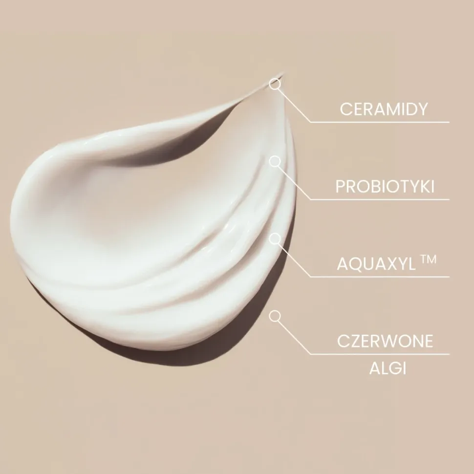 - ekstrakt z czerwonej algi – nawilża mocniej niż kwas hialuronowy i przyspiesza syntezęceramidów o +56%,