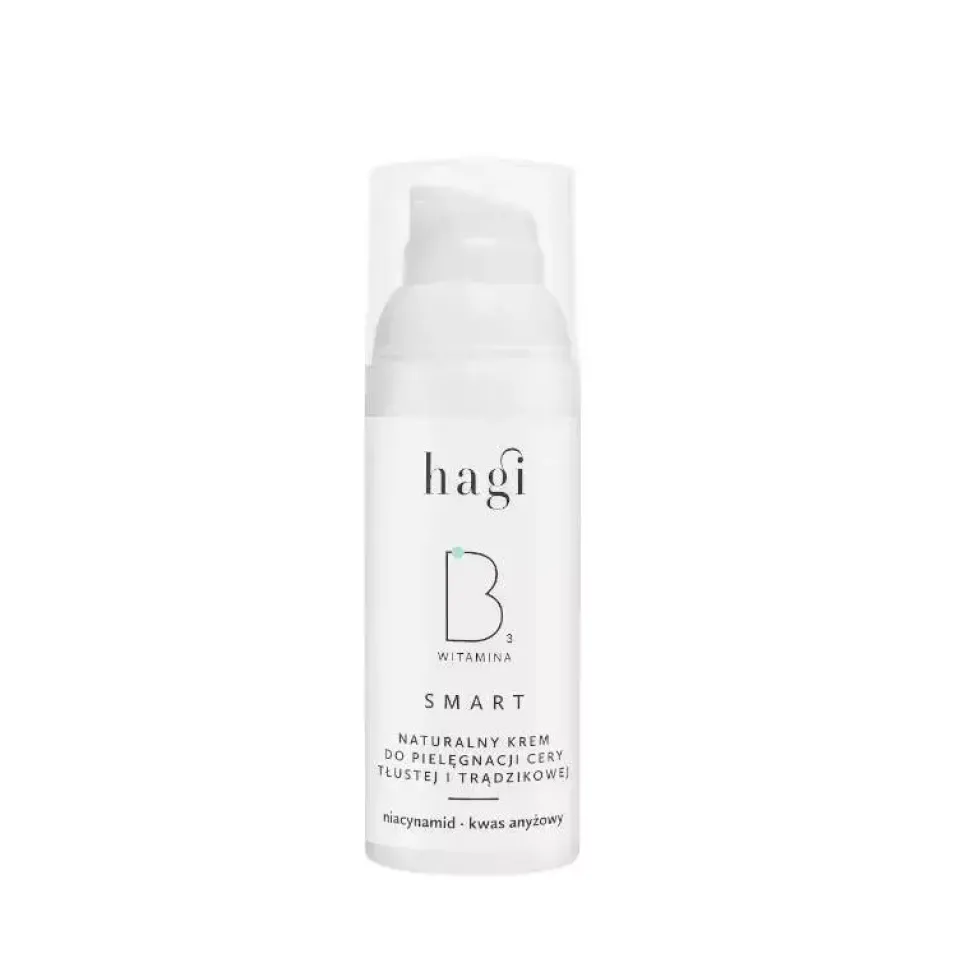 Krem do cery z niacynamidem Hagi SMART to kompozycja zaawansowanych składników wspomagających regulację wydzielania sebum oraz zapewniających prawidłowy poziom nawilżenia wymagającej skóry. Bisabolol oraz olej krokoszowy koi stany zapalne wywołane trądzikiem. Kompleks roślinny z zielonej herbaty, jaśminu i brzoskwini zapewnia komfortowe wykończenie i szybkie wchłanianie kremu.