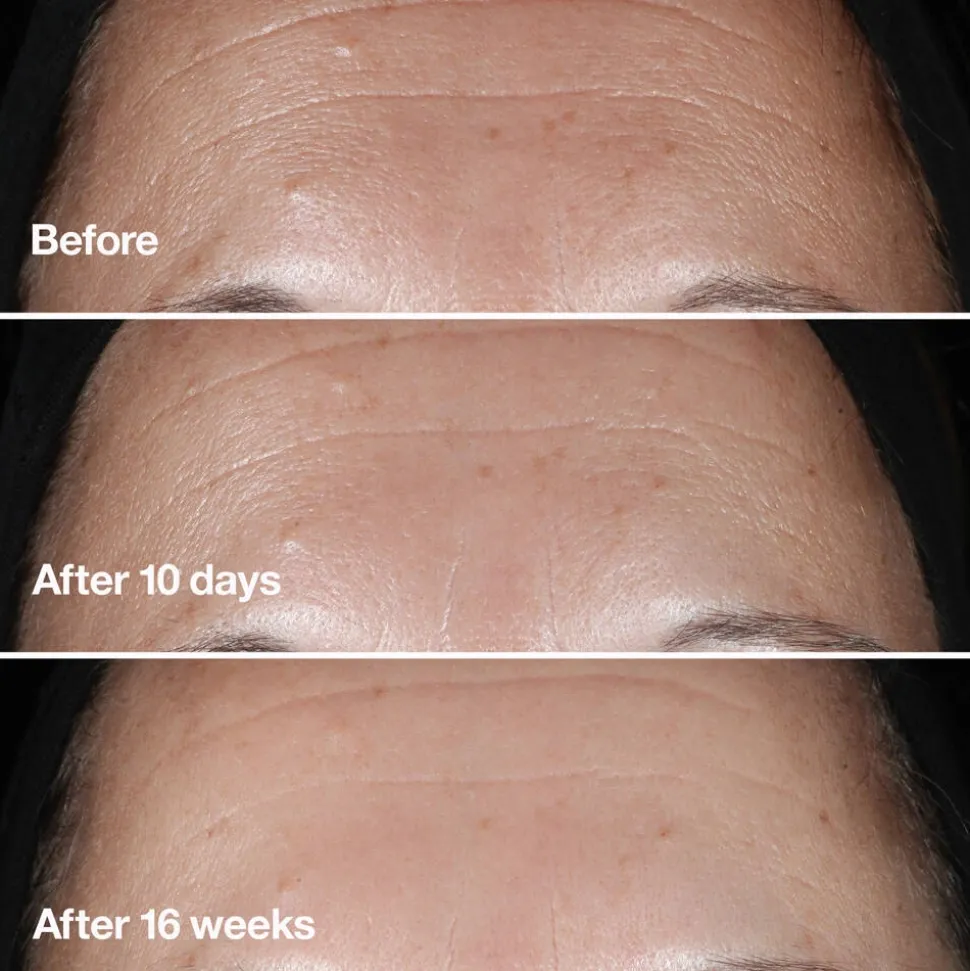 Po upływie 10 dni: Skóra wygląda na rozjaśnioną i staje się gładsza w dotyku, a drobne linie na twarzy oraz zmarszczki mimiczne w jej górnej części ulegają znacznemu wygładzeniu. Lwia zmarszczka staje się mniej widoczna, a uporczywie utrzymujące się na czole linie tracą na wyrazistości.
