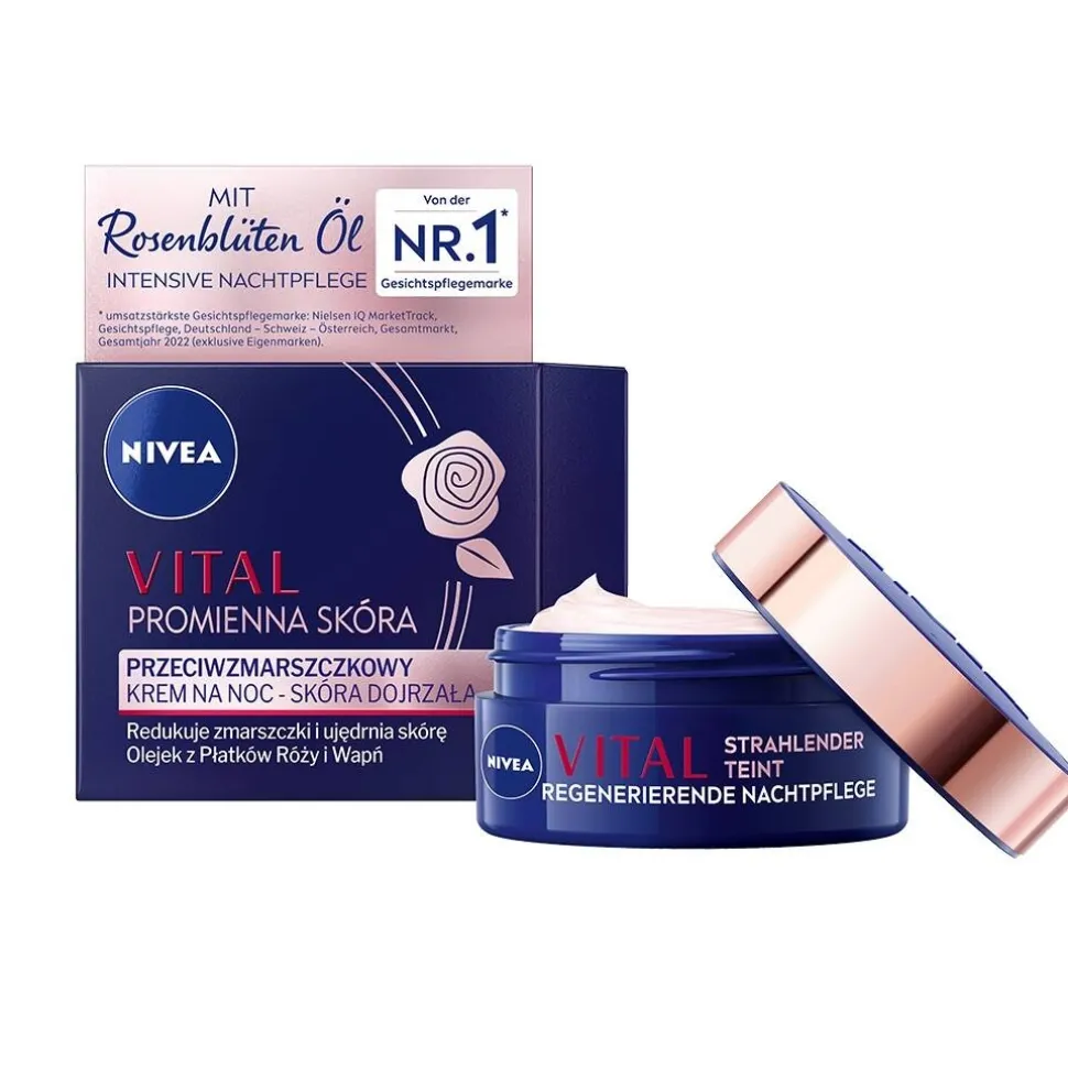 VITAL PROMIENNA SKÓRA Przeciwzmarszczkowy krem na noc dla skóry dojrzałej. Jego formuła z Olejkiem z Płatków Róży i Wapniem została opracowana specjalnie dla potrzeb skóry dojrzałej. Intensywnie odżywia skórę w nocy, zapewniając jej wypoczęty wygląd o poranku. Ujędrnia i wygładza skórę. Zawarta w formule Kreatyna stymuluje komórki do produkcji własnego kolagenu.* Efekt? Widocznie zredukowane zmarszczki oraz intensywnie nawilżona, jędrna skóra, a także zdrowo wyglądająca, promienna cera. Krem należy stosować codziennie wieczorem, po dokładnym oczyszczeniu twarzy. Tolerancja dla skóry potwierdzona dermatologicznie.