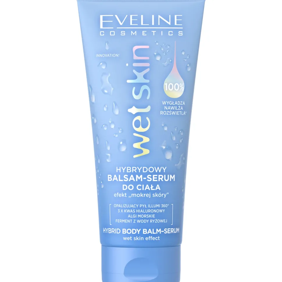 Hybrydowy balsam-serum do ciała Eveline Wet Skin z opalizującym pyłem. Wygładza, nawilża i rozświetla, pozostawia efekt „mokrej skóry”.